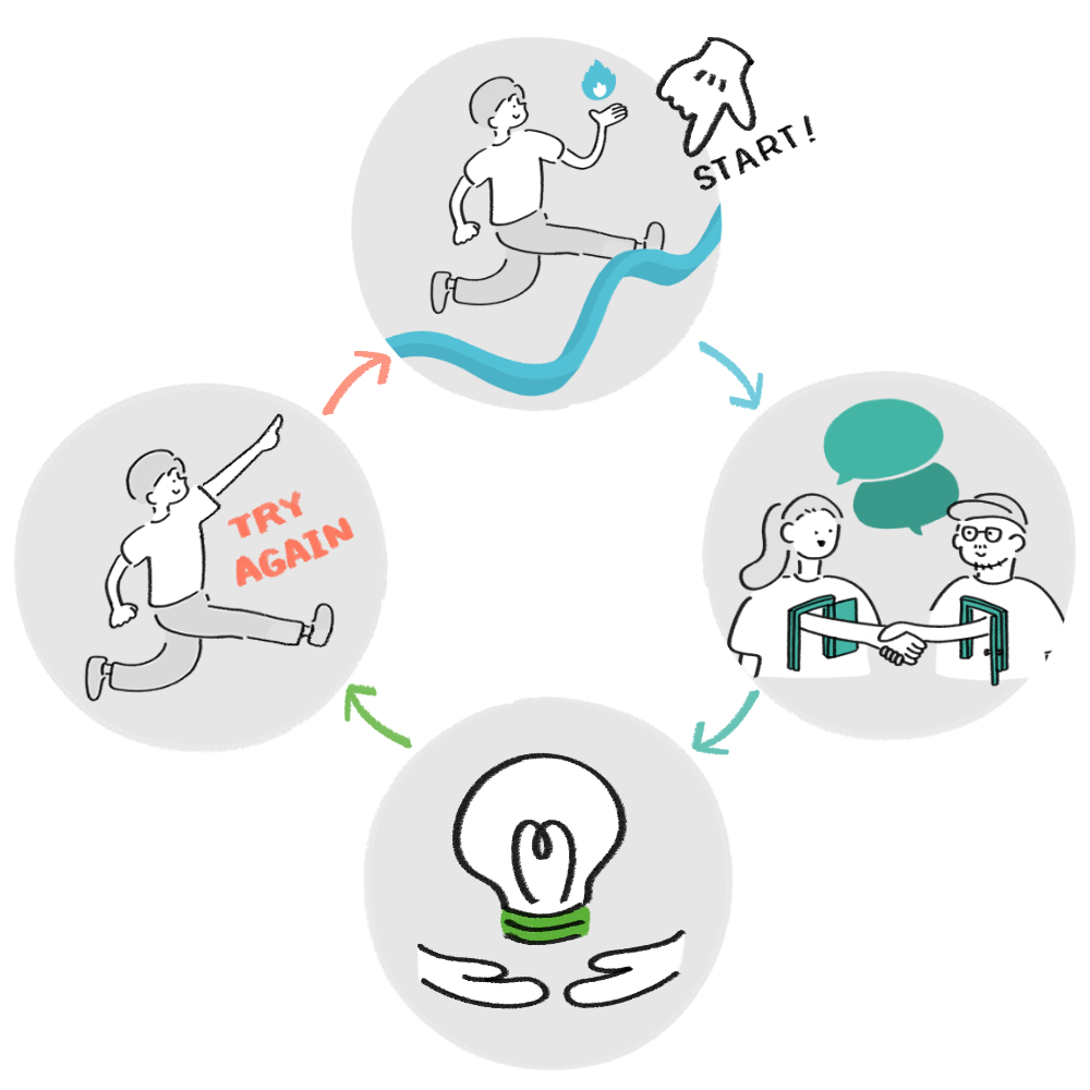 Circle Kaizen cycle until success by Step out your 1st step → Communicate with other → Kaizen → Action → Retry
