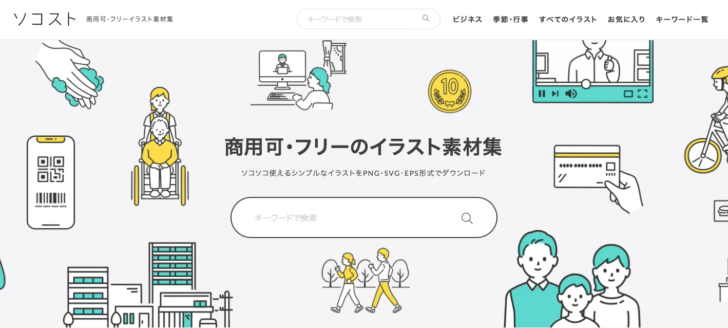 ソコストはシンプルで汎用性が高いイラストサイトで、イラスト数はそこまで多くないのですが、商用としては使いやすいイラストが多く用意されています。