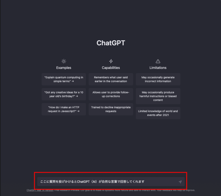 ChatGPTの始め方は非常に簡単で他のウェブツールと同じく公式サイトからログインして、枠内に好きな文章や質問を入力するだけです。
