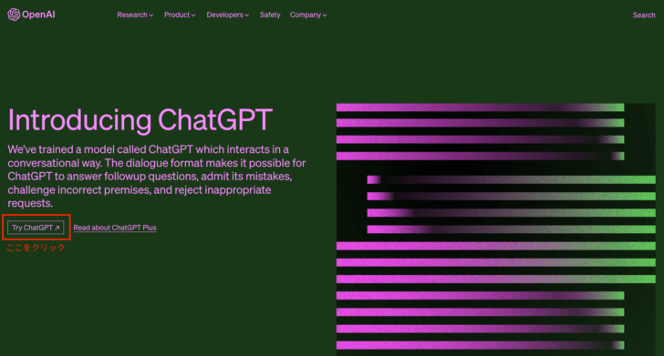 ③トップ画面の左側「Try ChatGPT」をクリックしてアカウントを作成します。