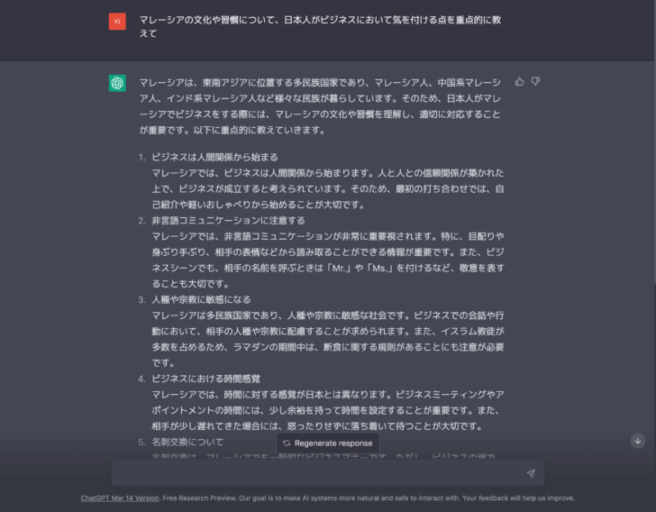 マレーシアの文化や習慣についての情報もChatGPTから得ることができ、異文化適応のための支援になります。
